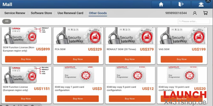 As of now, all Launch X431 tablets with 7-inch, 8-inch, and 10.1-inch or larger screens can buy VAG, FCA, Renault, and Benz security licenses directly in the Mall. Follow the purchase instructions below.