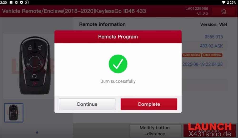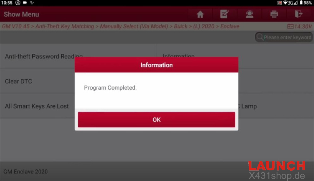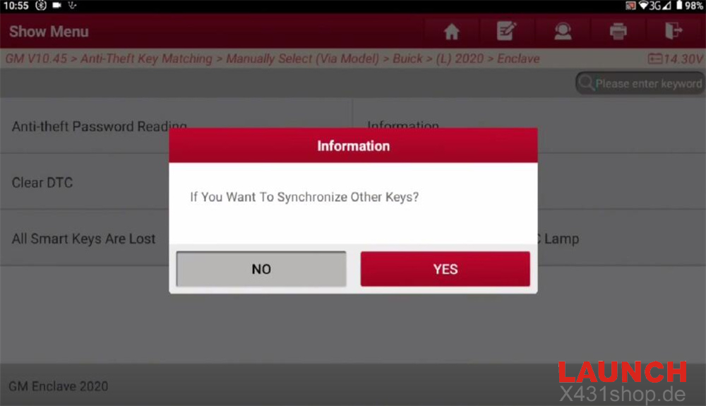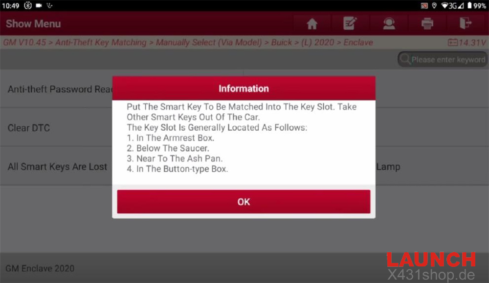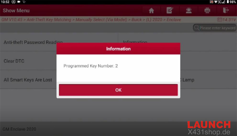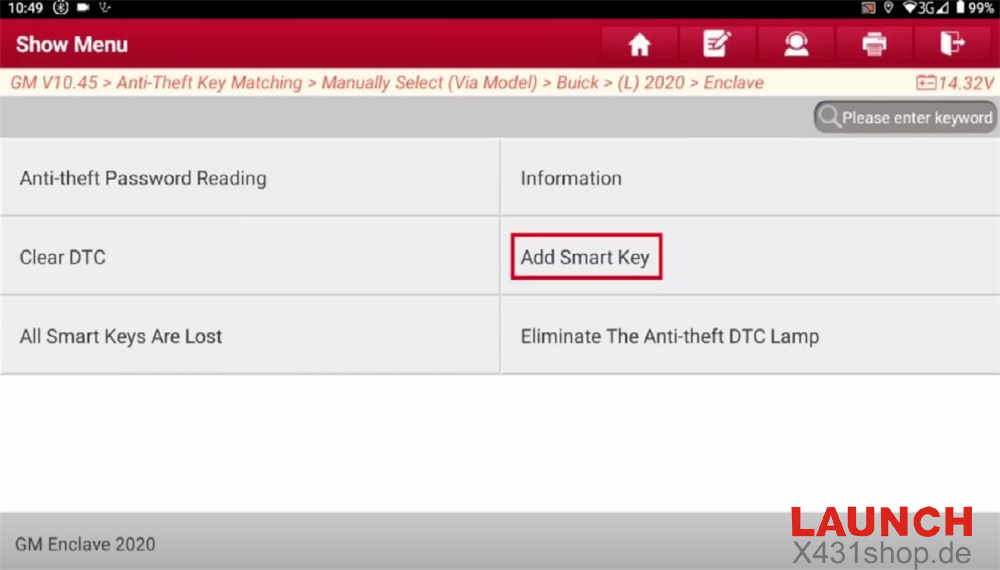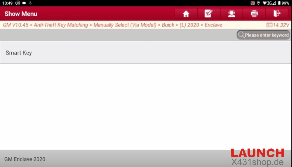 GM software (e.g. V10.45)-> Anti-Theft Key Matching-> Manually Select (Via Model)-> Buick-> (L) 2020-> Enclave-> Smart Key-> Add Smart Key