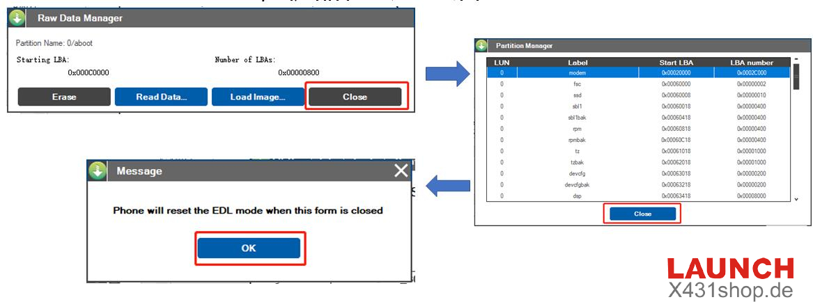 Wait for the flashing process to complete, then click Close → Close → OK.