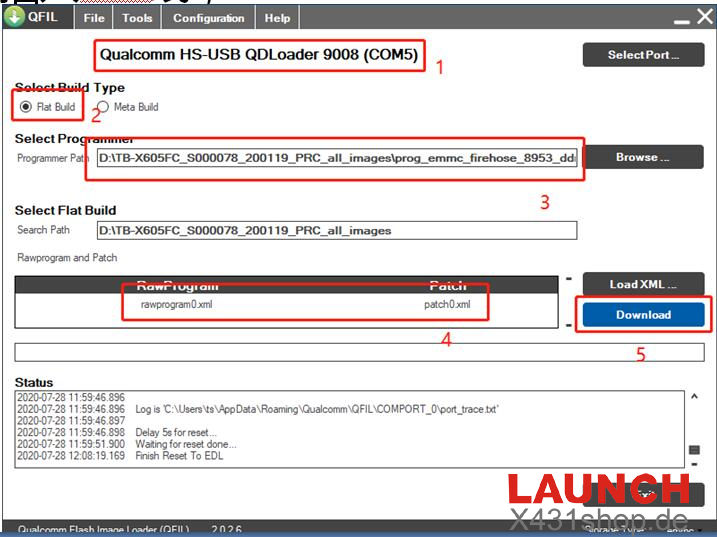 Open QFIL and load the software package TB-X605FC_S000078_200119_PRC.