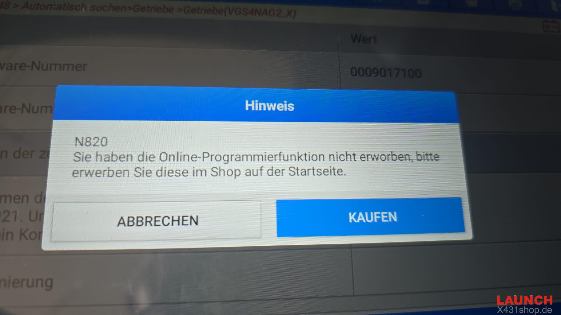 This error typically indicates that the online programming function hasn’t been purchased or activated. The system prompts users to acquire this feature through the shop on the homepage. For Mercedes-Benz online coding operations, particularly for transmission programming (VGS4NAG2_X), the PAD series devices are specifically required to ensure compatibility and functionality.