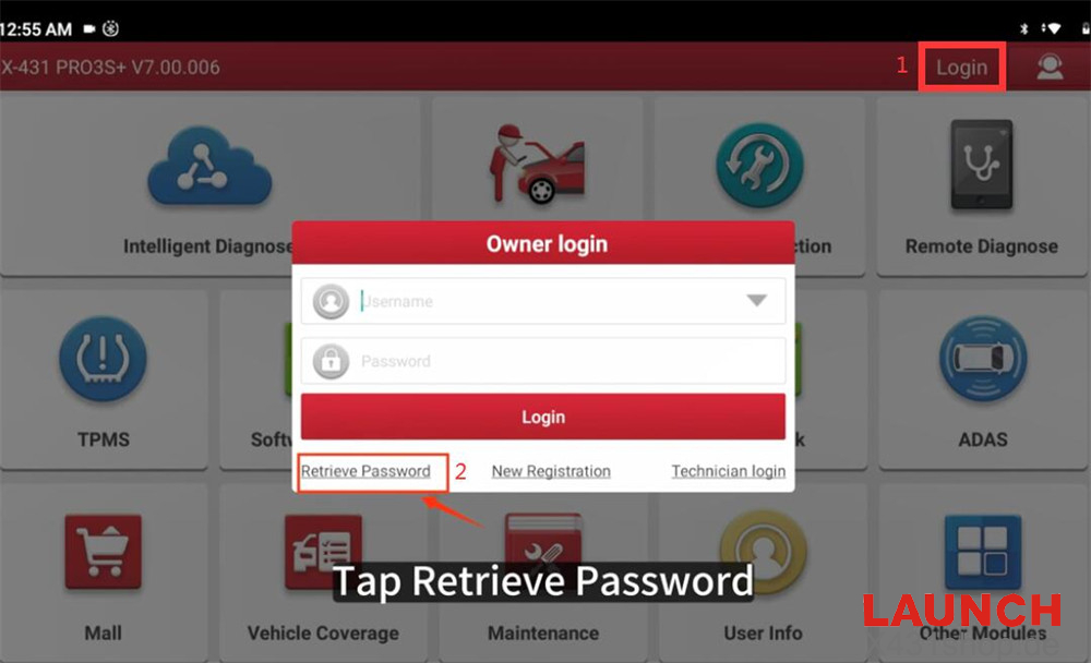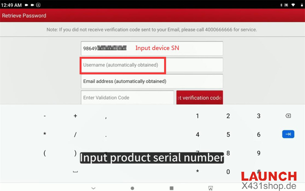 If you’ve forgotten your Launch X431 username, you can easily retrieve it using the “Retrieve Password” function in the X431 App. Simply enter your device’s 12-digit serial number, and the system will automatically display the registered username and associated email address. You can then send a verification code to that email to recover or reset your account.
